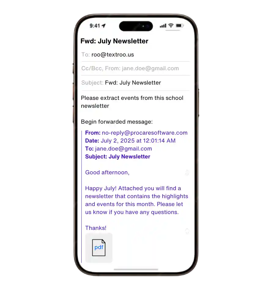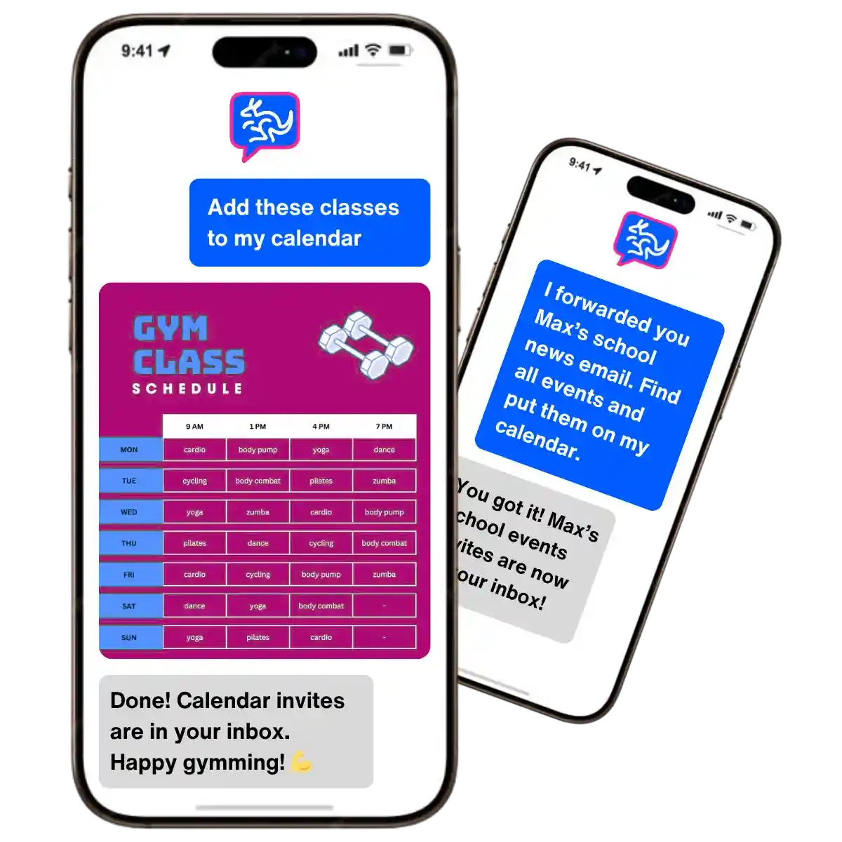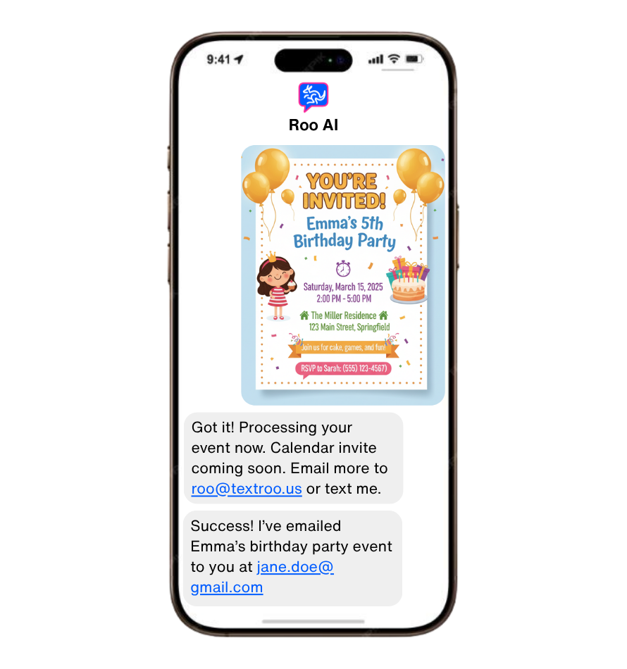 Roo handles your calendar and reminders via text. Forward event emails, voice-text reminders while driving, brain dump your to-dos. We track it all so you don't have to.